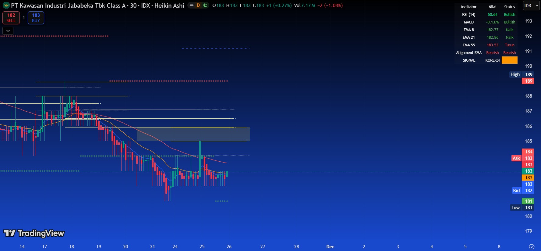 Jika harga tembus support 179, potensi penurunan lebih dalam menuju 175-177 (area low sebelumnya).