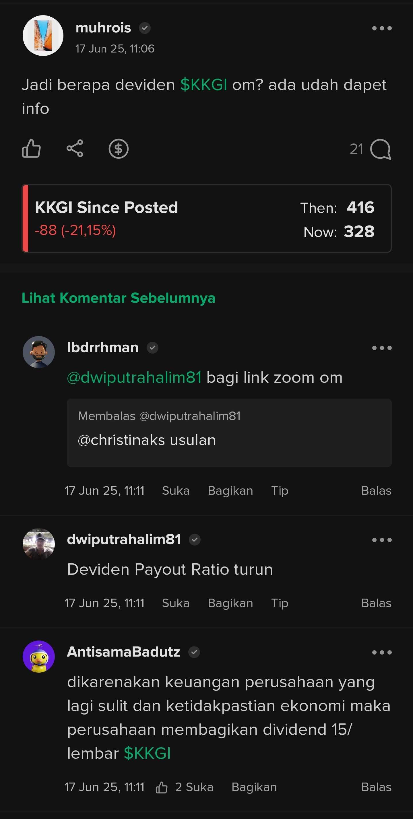 $KKGI H-3 sebelum keputusan Deviden (weekend g dihitung), apakah akan terbang ke 350an atau hanya sekedar ke 330an, semua tergantung besaran devidennya, g usah muluk2 cukup antara 5-25 saja.. lumayan buat beli cilok wkwkwk..