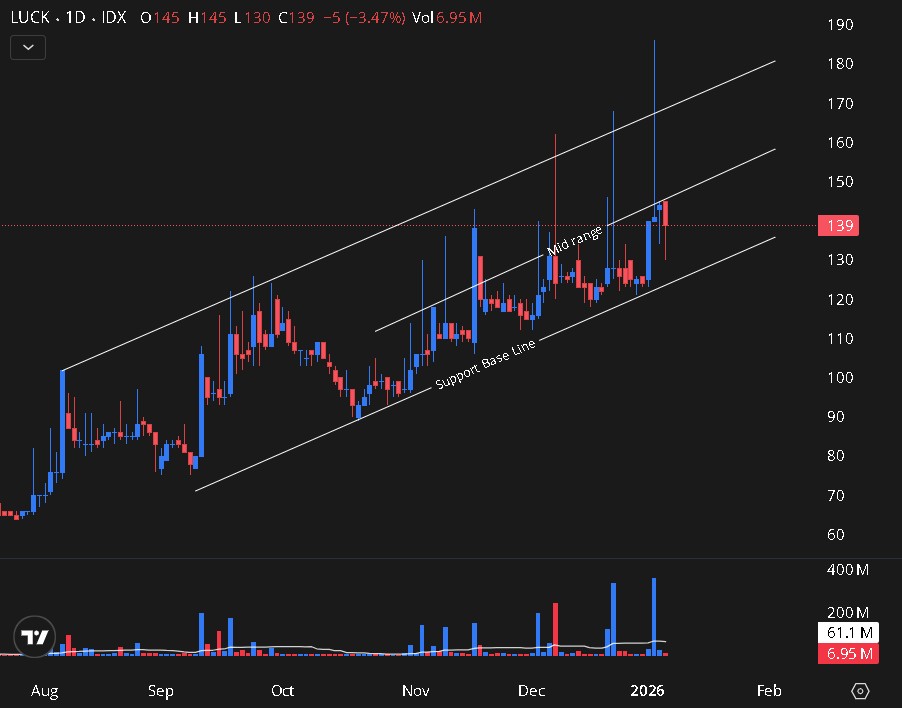 $LUCK kalau dari trend nya sedang naik. Dan jika area trend ini dibagi menjadi 2 level area, harga sering berada di area Mid-Low range dan sering membuat jarum sesaat ke atas.
