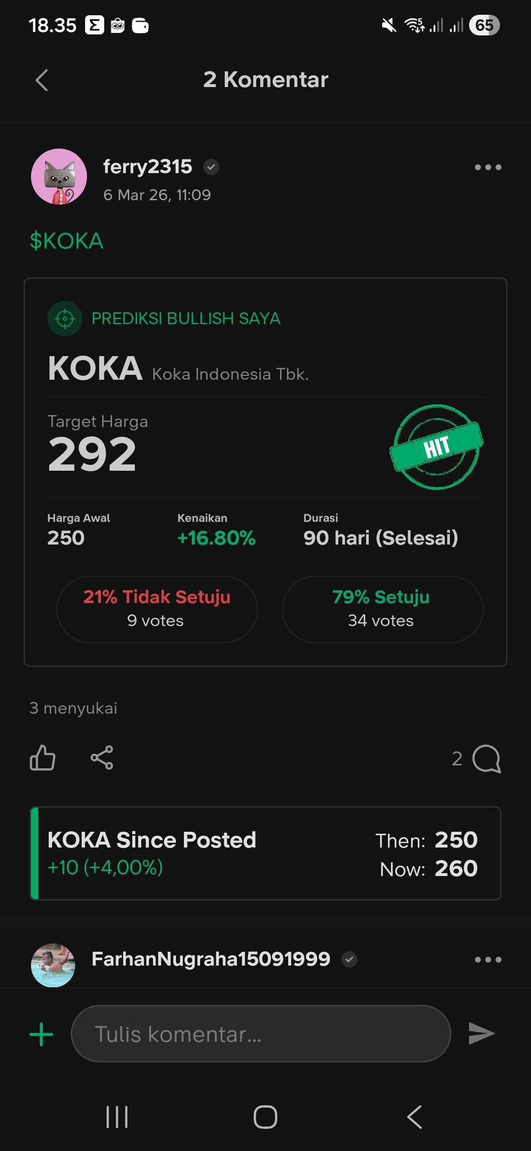 dan jika ada yg mengatakan $KOKA MMnya ngurus tipis tipis ya hiraukan aja., karna mMnya pegang di 259 avarage volume disini sepi tapi 1-2bulan sekali ditarik