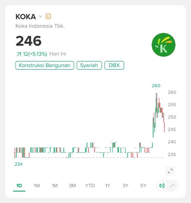 PT Koka Indonesia Tbk (βPerseroanβ) adalah suatu perseroan terbatas yang didirikan pada tahun 2011 dan bergerak dalam bidang kontraktor umum proyek konstruksi, teknik mesin, teknik geoteknik, desain interior, dan furniture. Perseroan memiliki kualifikasi yang tinggi dalam bidang konstruksi bangunan, konstruksi industri pabrik, dan jembatan & terowongan, dimana Perseroan telah melakukan serangkaian proyek rekayasa investasi dan konstruksi di Indonesia . Selama lebih dari 10 (sepuluh) tahun, Perseroan telah mengerjakan lebih dari 100 proyek di Indonesia, dimana dalam menjalankan kegiatan usahanya Perseroan menerapkan sistem manaje... Read More
