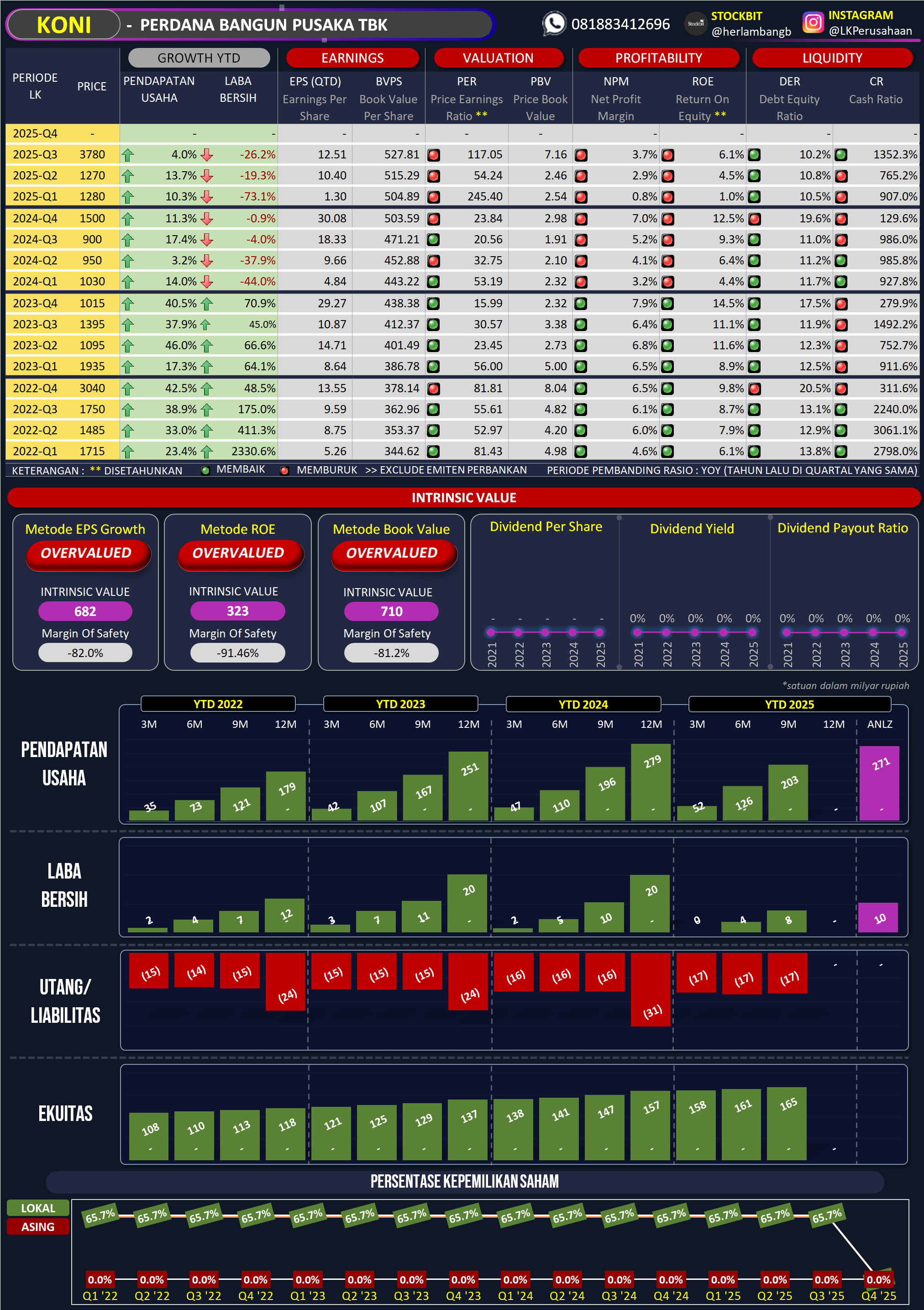 KONI strong breakout pasca-konsolidasi panjang, trend dan volume menguat memberi peluang scalping/swing volatil, risiko overbought dan distribusi bandar sangat tinggi, prioritas disiplin SL.