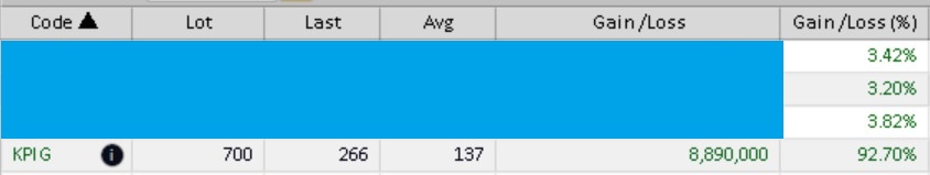 4 saham swing trading di porto saya. $KPIG masih dipantau utk mencari area exit TP. Sedangkan 3 lainnya perlahan meningkat.