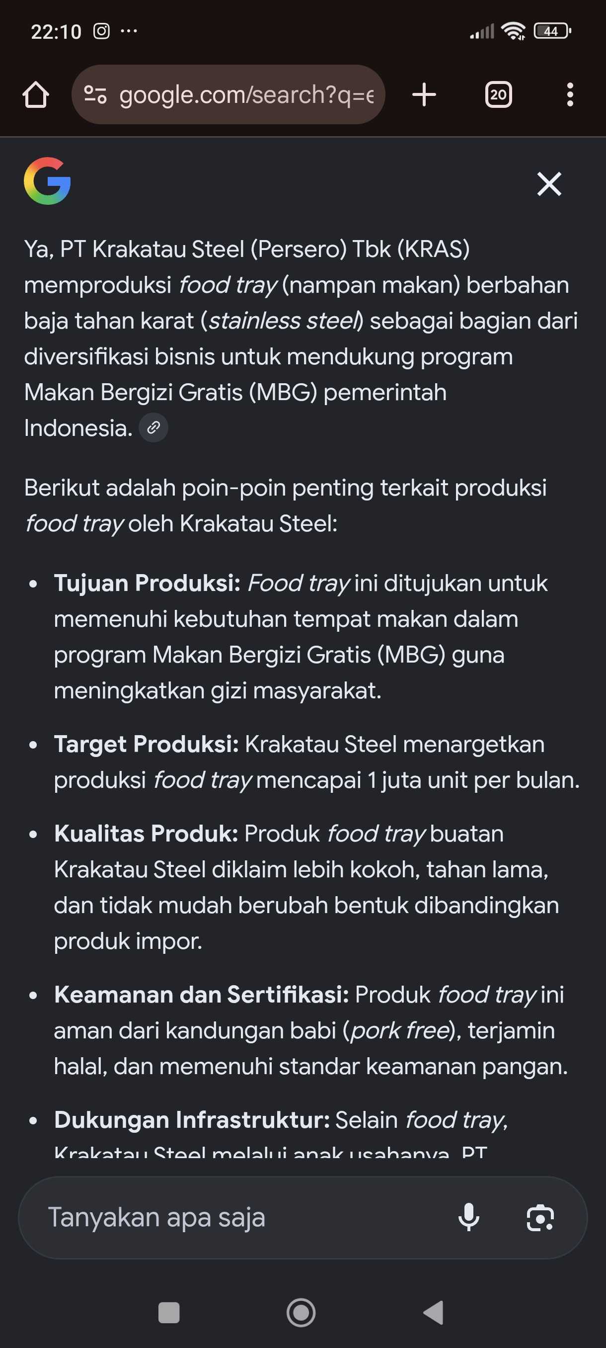 * *KRAS* : Sekretaris Perusahaan *PT Krakatau Steel (KRAS)* , Fedaus, mengatakan KRAS memperoleh dukungan Danantara untuk 2 proyek hilirisasi baja. Pertama, proyek pengolahan pasir besi untuk pembuatan bahan baku produksi slab. Kedua, proyek nikel yang dipakai untuk bahan baku pembuatan stainless steel. (Kontan)