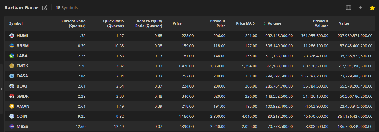 note : HANYA sekedar berbagi HASIL FILTER SCREENER, untuk dijadikan pertimbangan. TIDAK BERBAGI RUMUS / Preset Screener !!! DAN Terima kasih, untuk kamu yang sudah kasih TIP 🙏