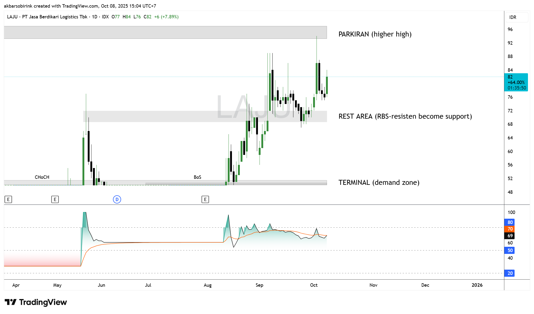 Bus LAJU ini sudah menempuh perjalanan jauh dan sekarang lagi ngetem di antara dua titik penting. Dia sukses ganti jalur (ChoCH) dan bobol (BoS) dari TERMINAL (Demand Zone), dan sekarang dia lagi nyaman konsolidasi di REST AREA (RBS) di area 70-an. Sopirnya lagi pusing milih mau parkir di puncak baru (PARKIRAN higher high) atau mau mundur sedikit buat isi bensin 😂. Momentumnya sendiri baru angkat kepala lagi dari area netral.