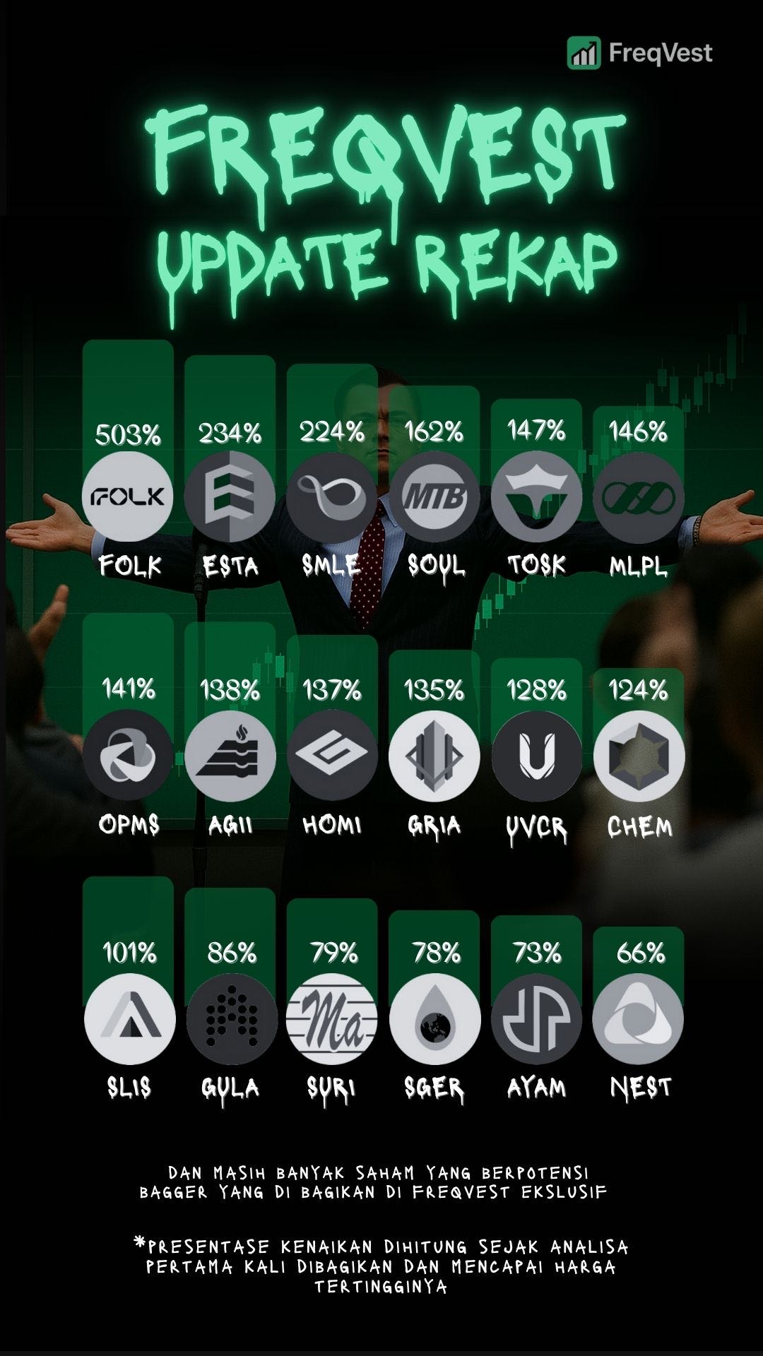 UPDATE REKAP HASIL ANALISA FREQVEST DENGAN STRATEGI YANG SUDAH DI JELASKAN DI EBOOK 2 FREQVEST YANG SUDAH TERBUKTI DAPAT MENDETEKSI SAHAM BAGGER LEBIH AWALπ