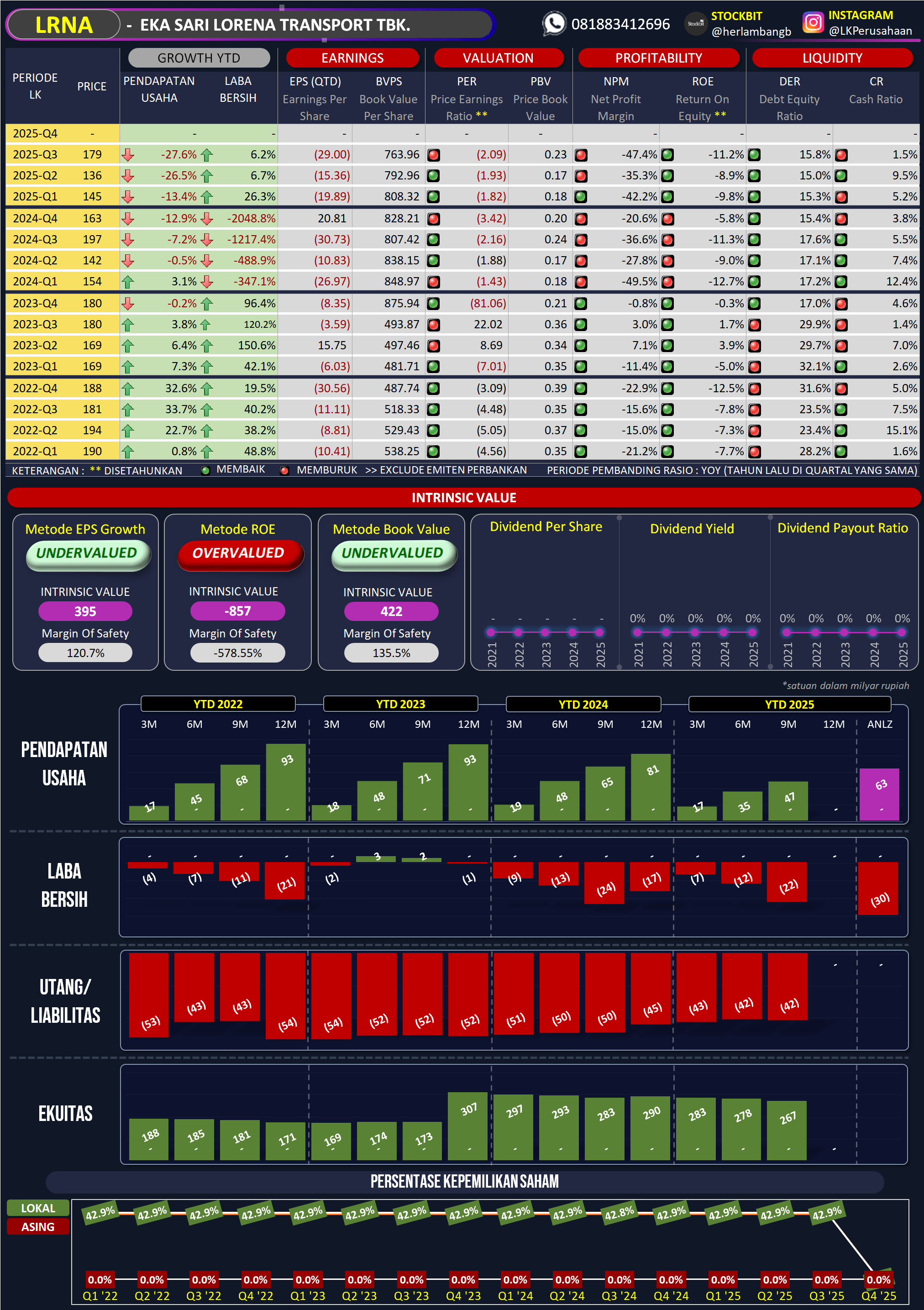 PT. Eka Sari Lorena Transport Tbk berada di bawah grup Lorena dan didirikan pada tanggal 26 Februari 2002. Perusahaan ini bergerak dalam bidang jasa transportasi darat, seperti angkutan umum, antar daerah yang melayani rute Jawa, Madura, Bali dan Sumatera serta Busway Transjakarta. Lorena Group berfokus pada segmen transportasi. Lorena Group telah berkembang dan sekarang memiliki Lorena Karina (Holding Company) dengan beberapa anak perusahaan, seperti Eka Sari Lorena Transport, Ryanta Mitra Karina, Eka Sari Lorena - ESL Express, Eka Sari Lorena Logistics, Piagam & Piagam Lor Lorena, Eka Sari Lorena Airlines, KSJ Perkebunan Kelap... Read More