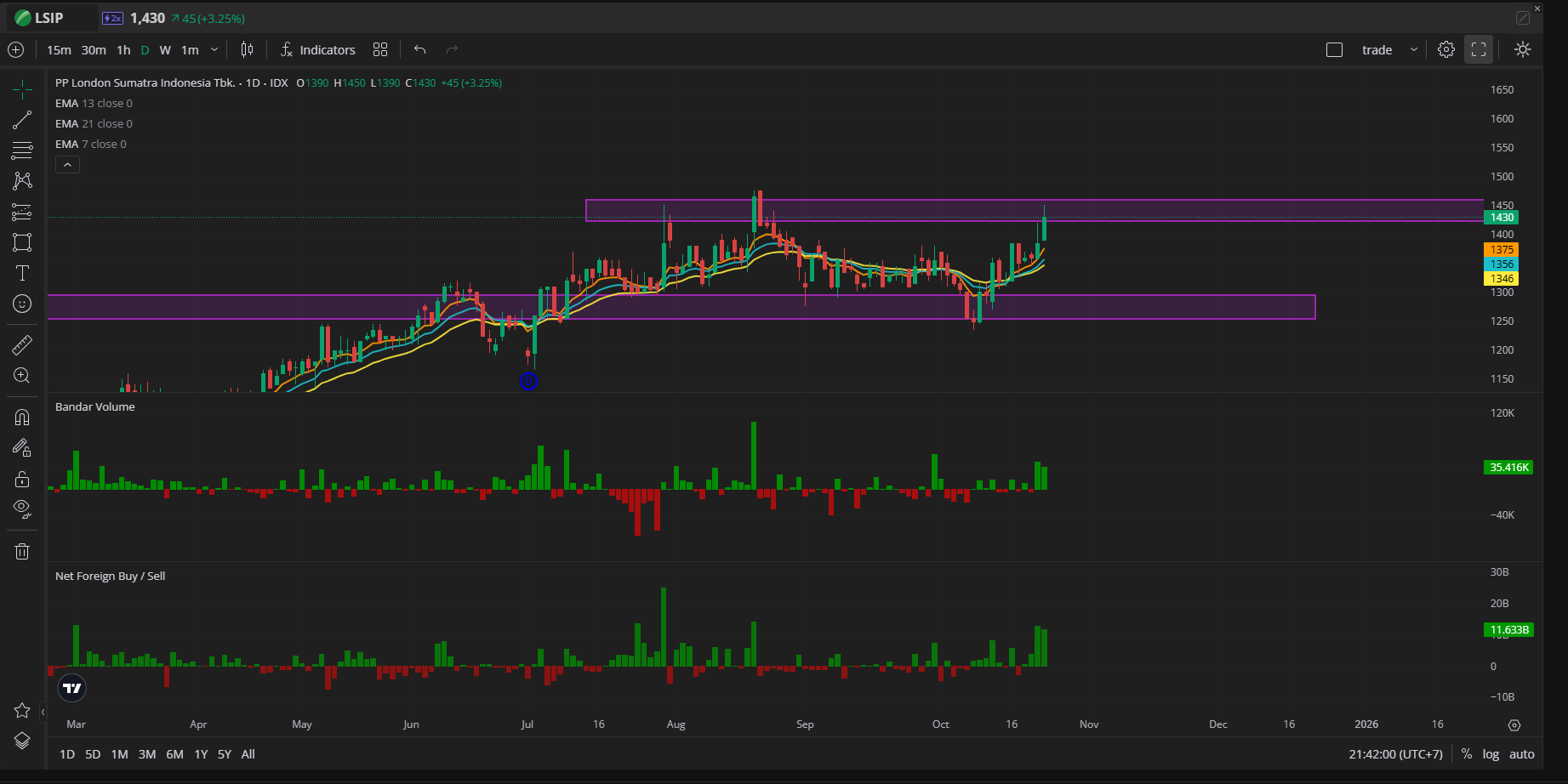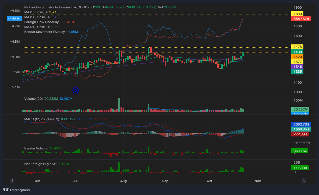 1. $LSIP (Leading) – Saham perkebunan sawit ini sedang diuntungkan harga CPO yang stabil tinggi dan ekspor yang mulai pulih. Secara teknikal, LSIP sudah breakout dari konsolidasi dengan volume meningkat — peluang lanjut ke area 1.300–1.400 masih terbuka.