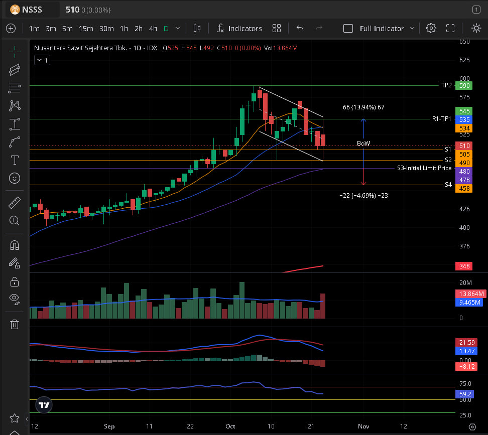 Target TP1 = Rp 2.550 – 2.650 Hold / exit sebagian jika tekanan jual muncul