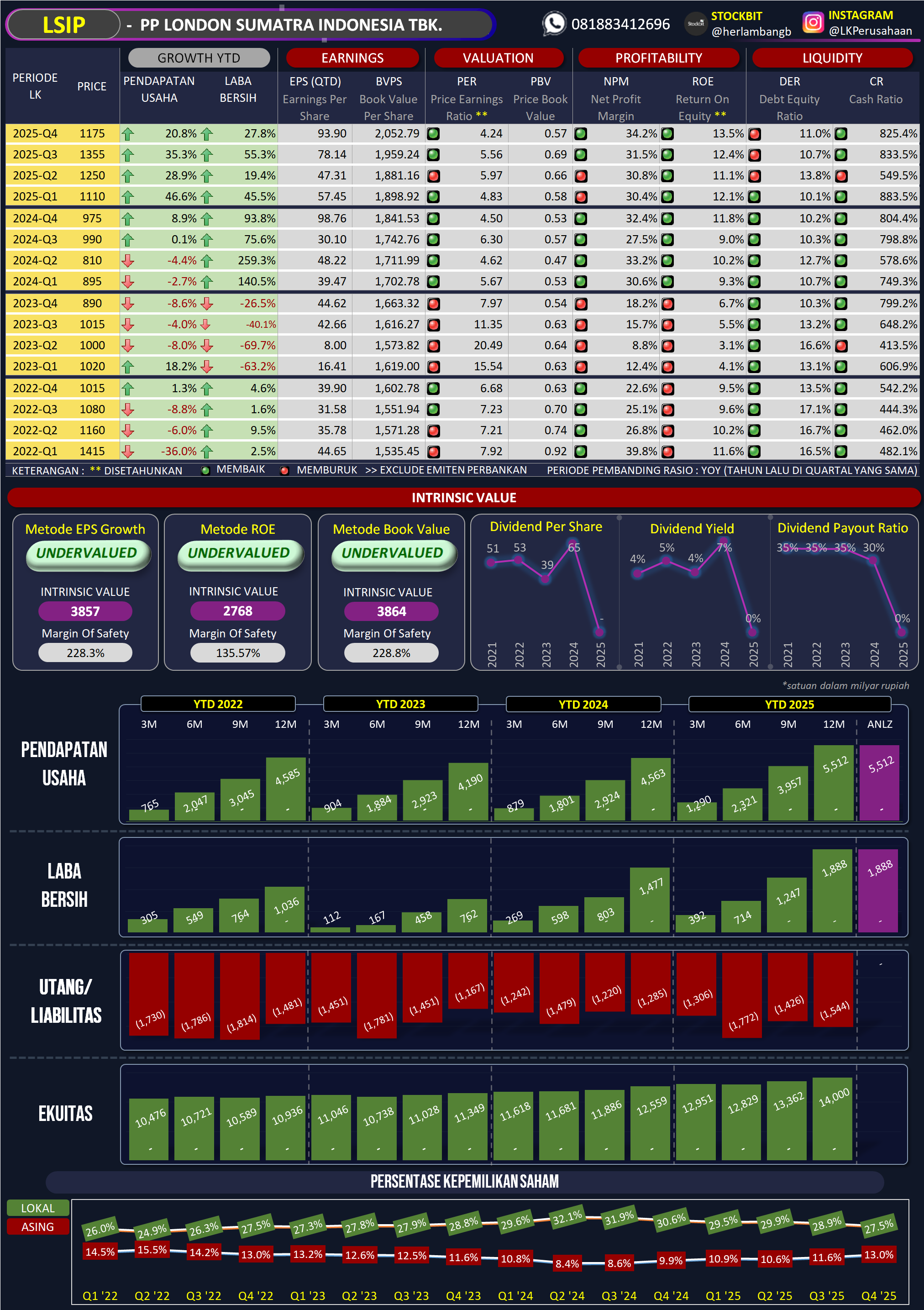 LSIP adalah tipe saham yang sangat cocok untuk investor tipe *Value* atau profil risiko konservatif. Dengan posisi kas yang setara setengah dari total asetnya dan nyaris tanpa utang berbunga, fundamental LSIP sangatlah tebal. Saham ini layak Anda pertimbangkan untuk koleksi jangka menengah hingga panjang, terutama untuk menikmati dividen rutin.