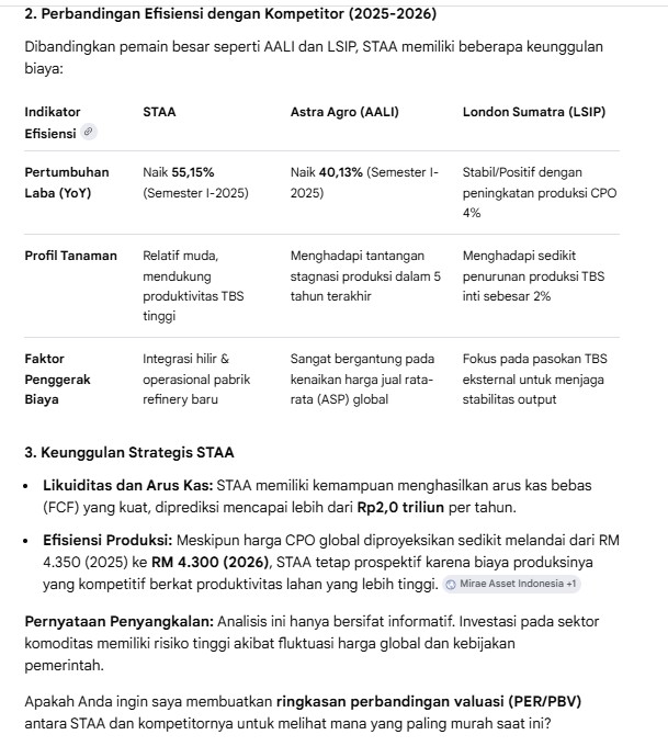 Laporan keuangan AALI ini telah diaudit dan mendapatkan opini "Wajar Tanpa Modifikasian" (Unqualified). Secara fundamental, AALI berada dalam posisi yang sangat superior di tahun 2025. Perusahaan menikmati masa panen dari tingginya penjualan CPO dan produk turunannya, sekaligus menunjukkan disiplin finansial (melunasi utang bank) yang membuat struktur modalnya menjadi jauh lebih efisien dan tangguh terhadap gejolak bunga di masa depan.
