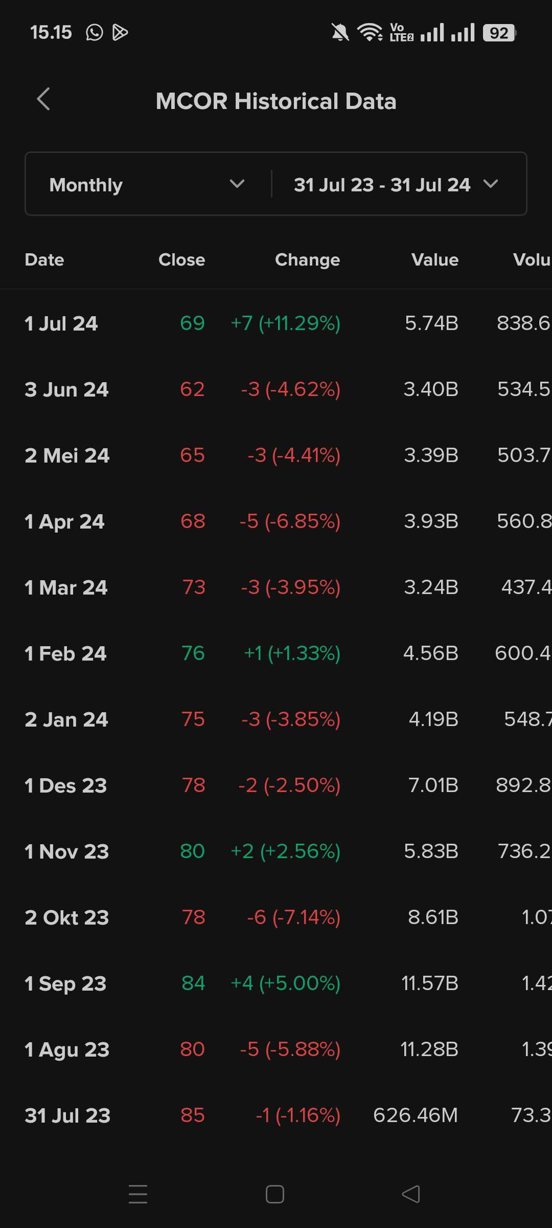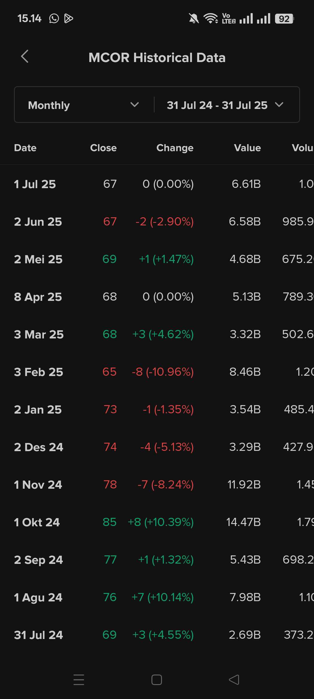 transaksi bulanan $MCOR yg seperti ini.. mayoritas hanya bbrp M/bulan. periode 31-07-2024 s/d 31-07-2025