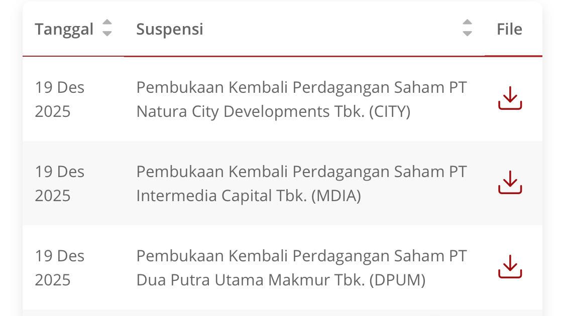 STOCKWATCH.ID (JAKARTA) β PT Bursa Efek Indonesia (BEI) menghentikan sementara perdagangan tiga saham emiten sekaligus. Keputusan ini mulai berlaku efektif pada sesi I perdagangan hari ini, Jumat, 19 Desember 2025.
