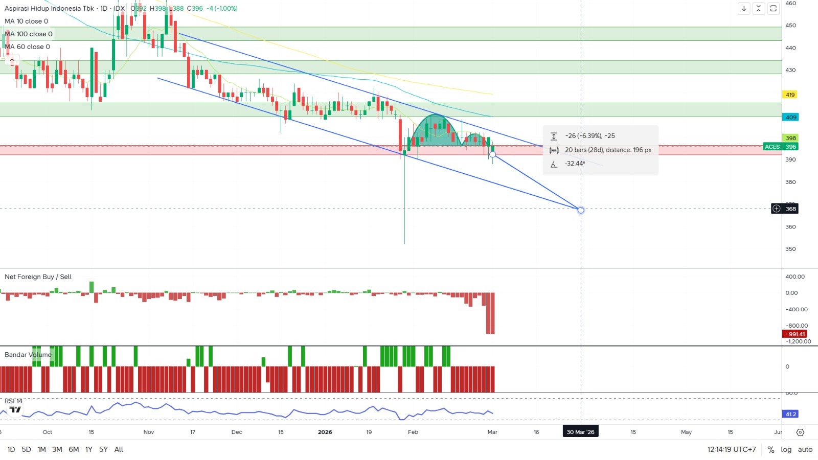 * **Alasan:** Secara teknikal tren masih *bearish* (turun). Belum ada tanda pembalikan arah yang kuat. SSSG yang masih negatif bisa menjadi sentimen pemberat dalam jangka pendek. Tunggu sampai ada rilis laporan keuangan yang menunjukkan perbaikan SSSG atau arus dana asing masuk kembali.