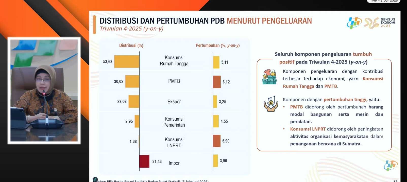 ✅ Semua komponen pengeluaran (konsumsi, investasi PMTB, belanja pemerintah, ekspor-impor) tumbuh secara merata, sama-sama mendukung tercapainya pertumbuhan ekonomi 5,39% di Q4 2025