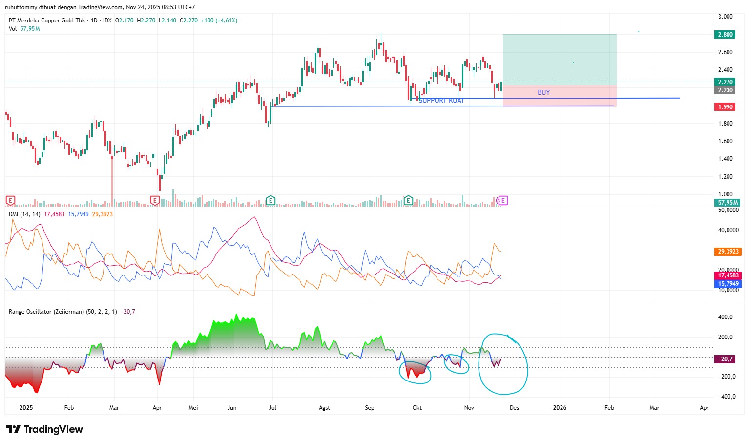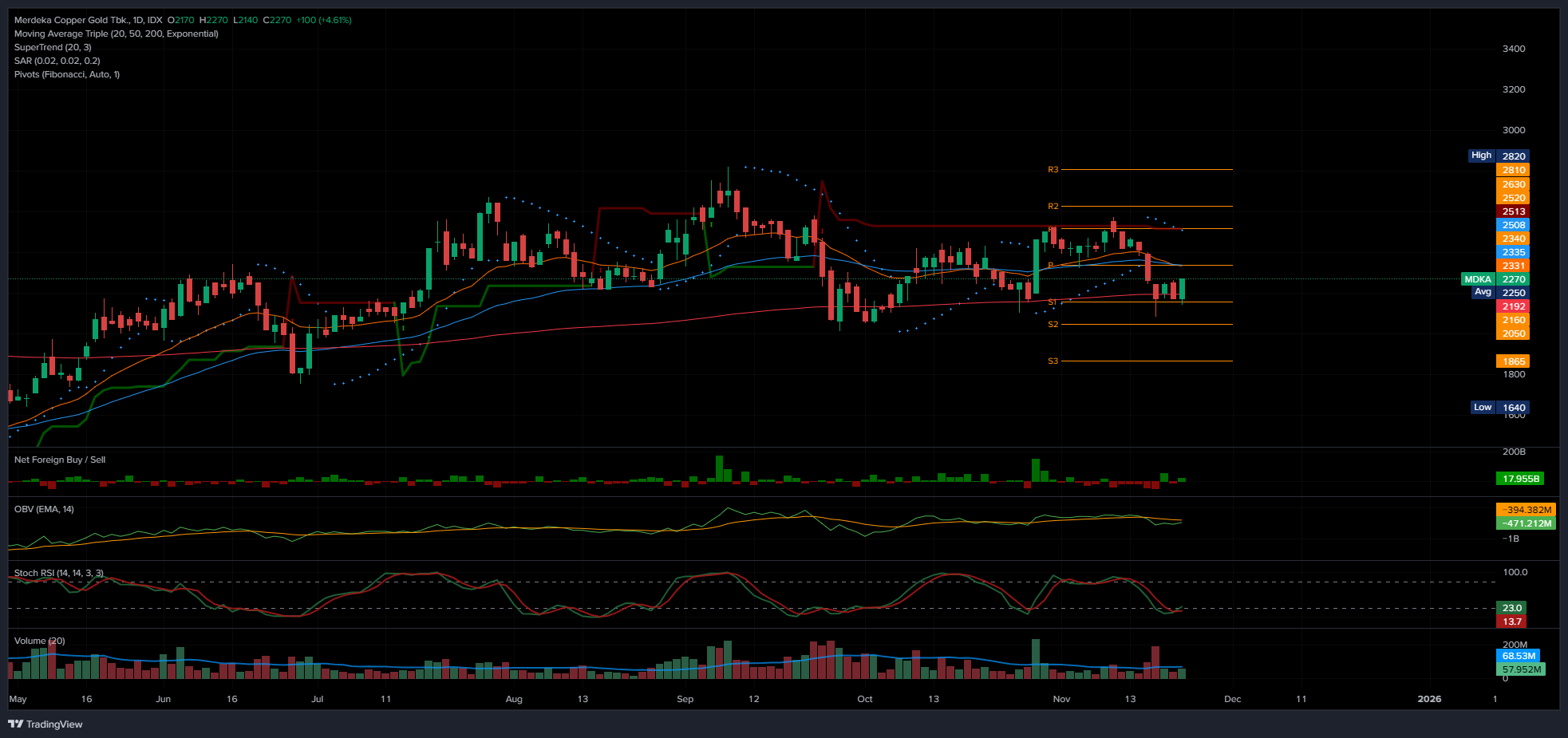 - MDKA masih berada dalam tren pendek melemah, tetapi sudah muncul sinyal awal pembalikan.