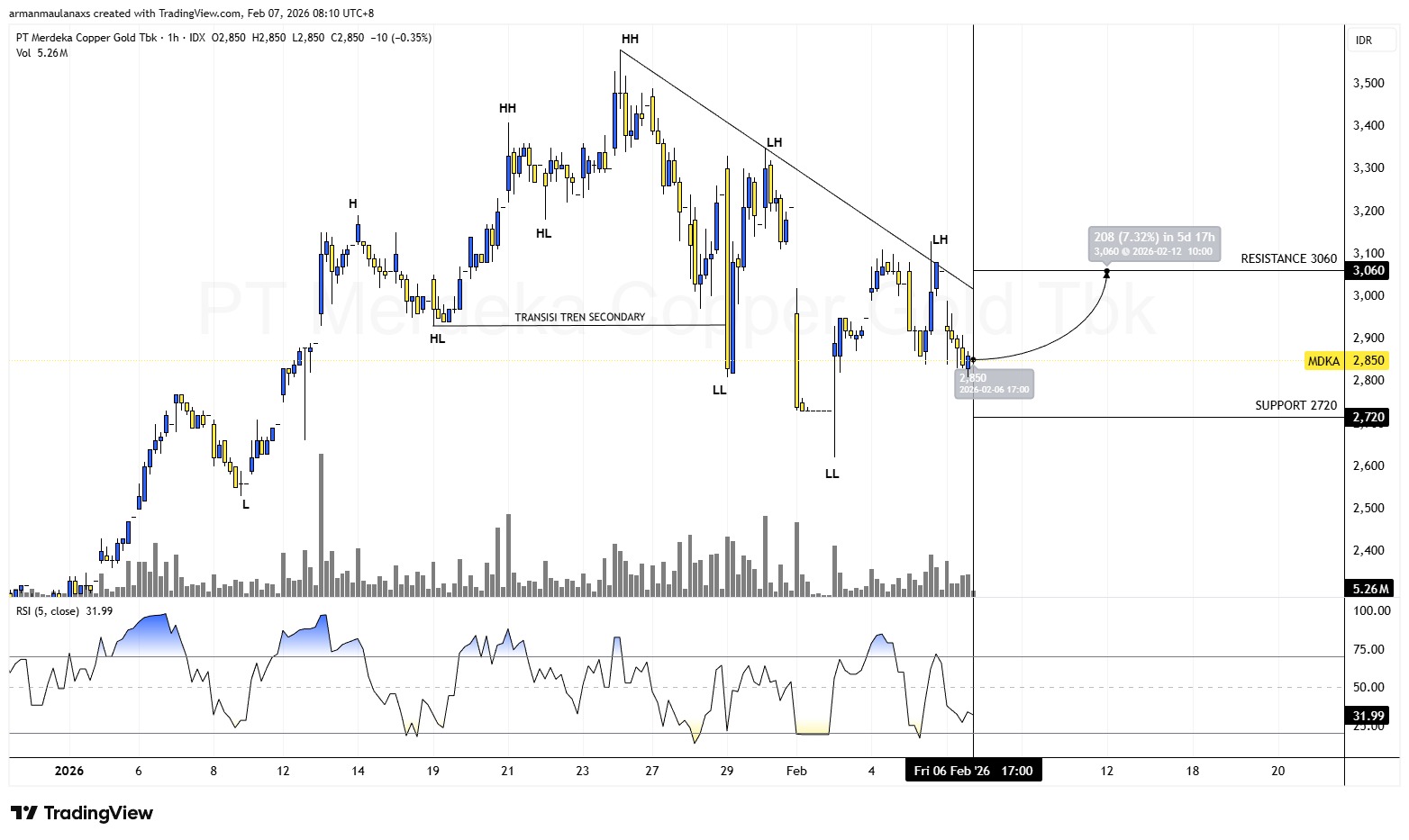 Harga berada di area support 2850 setelah membentuk Lower Low dan masih bergerak di bawah trendline turun. Dari current price 2850, terdapat potensi technical rebound ±7,3% menuju resistance 3060, dengan RSI(5) mendekati oversold (~32) mendukung rebound jangka pendek. Entry area 2820–2880, stop loss di bawah 2720. Trend utama masih bearish, sehingga setup ini bersifat counter trend.