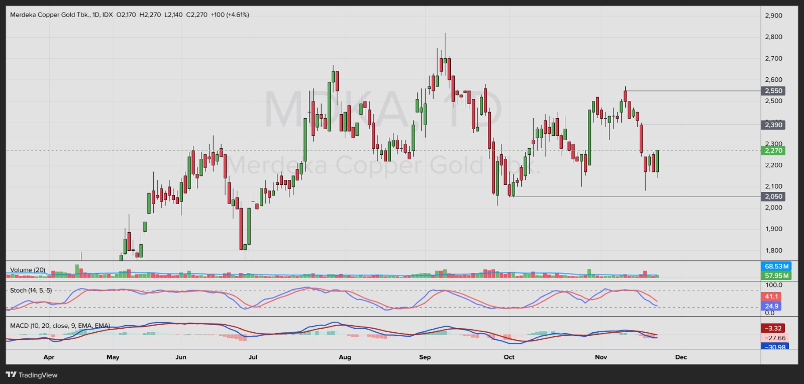 - Jika gagal breakout dan kembali di bawah 2.200, MDKA berpotensi kembali sideways di 2.050–2.300.
