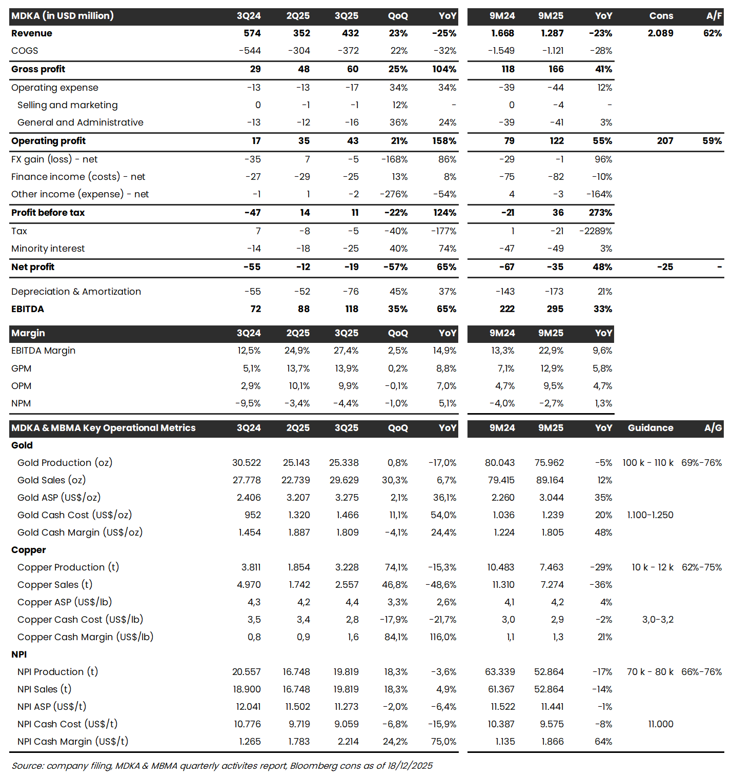 $MDKA: Merdeka Copper Gold mencatatkan rugi bersih sebesar US$19 juta pada 3Q25 (vs. 2Q25: rugi US$12 juta; 3Q24: rugi US$55 juta), sehingga rugi bersih selama 9M25 menjadi US$35 juta (vs. 9M24: rugi US$67 juta) dan di bawah ekspektasi 2025F konsensus yang memperkirakan rugi bersih US$25 juta. Secara operasional, laba usaha tercatat sebesar US$43 juta (+21% QoQ, +158% YoY) seiring kenaikan segmen nikel dan segmen emas akibat kenaikan volume penjualan emas (+30% QoQ). Meski demikian, laba bersih turun akibat kenaikan rugi pada proyek Wetar, kerugian proyek Pani karena belum beroperasi, dan kenaikan porsi laba untuk kepentingan non–pengendali sebesar US$25 juta pada 3Q25 (vs. 2Q25: US$18 juta, 3Q24: US$14 juta) seiring kepemilikan MDKA di segmen yang menghasilkan laba terbesar, MBMA, hanya sebesar 50,04% per 9M25.