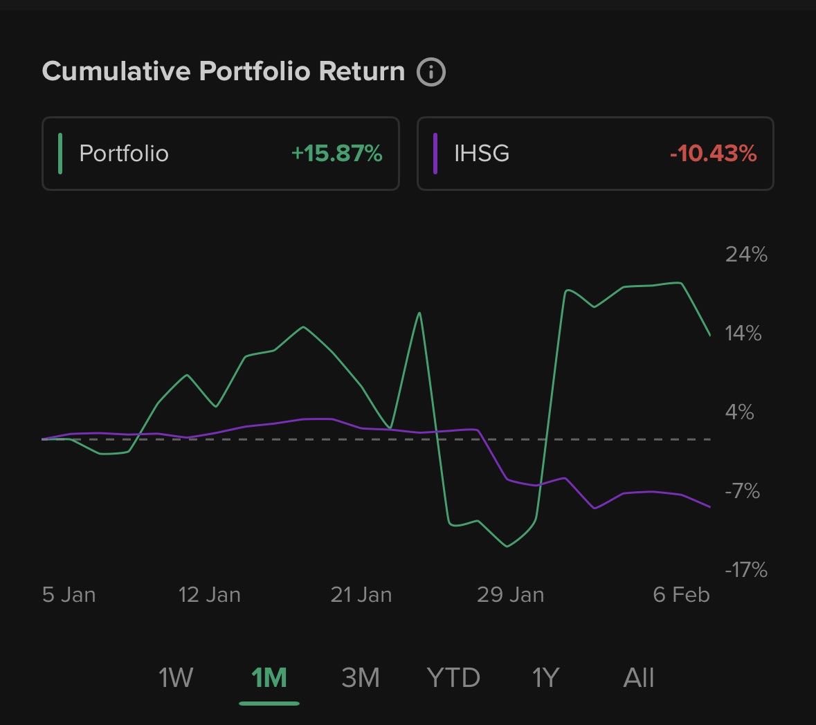 ihsg gonjang ganjing, tapi porto sebulan ini tetap aman, sempet drop karena anjlok ihsg 29 Jan. makin kesini makin dewasa menghadapi crash, cash is king (cash>40% dari porto).