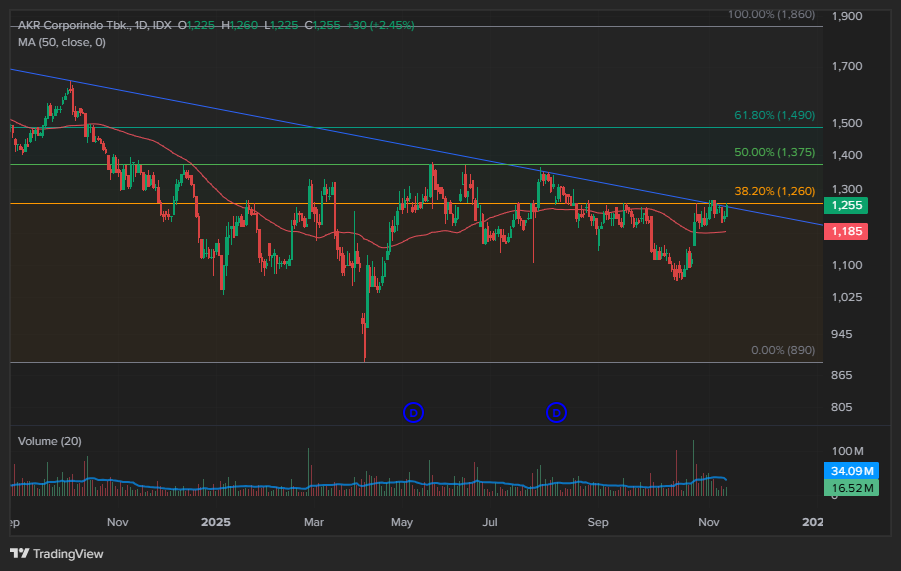 * Tren Harga: Ini dia puncak-nya. Harga hari ini (1205) RESMI jebol ke bawah support super kuat jangka panjang-nya, yaitu EMA 200 (garis oranye @ 1284). Harga-nya juga udah jauh di bawah EMA 50 (biru @ 1342). Ini tanda jelas kalo tren-nya udah berubah dari naik jadi turun.