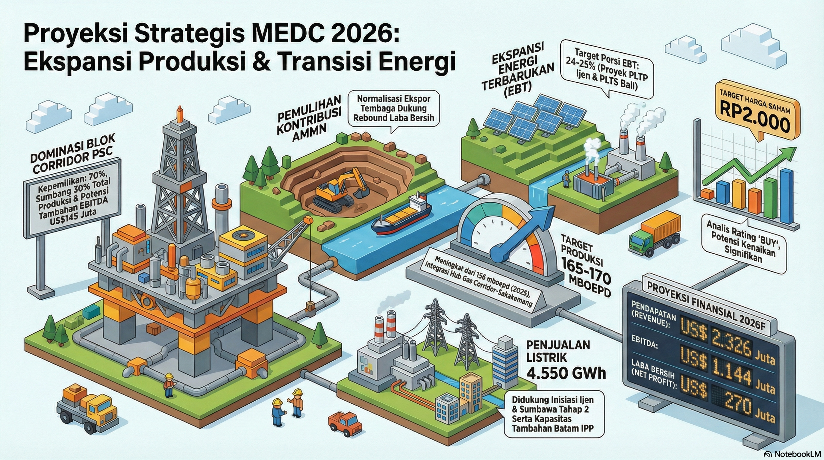 • Ekspansi Energi Terbarukan: MEDC menargetkan penjualan listrik sebesar 4.550 GWh, dengan porsi energi terbarukan (EBT) sebesar 24%. Proyek utama meliputi PLTP Ijen (geothermal) dan PLTS Bali yang diharapkan beroperasi penuh.