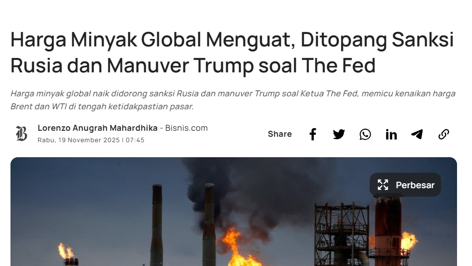— Harga minyak Brent: $63.91/bbl per 18 November, -12.82% YoY; harga batubara (ICI1 GAR6500): $102.32/ton, tren batubara turun, per hari ini.