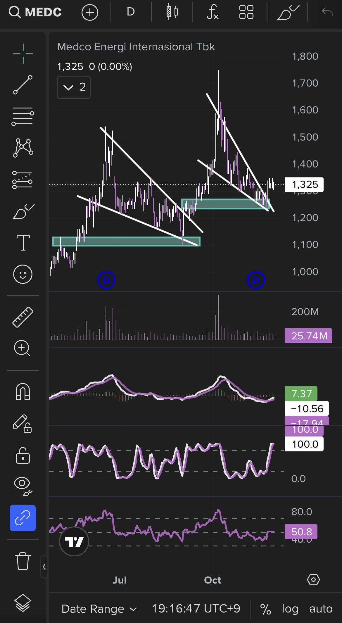 Dari pola yang kamu gambar di chart MEDC ini, ada dua pola utama yang terlihat β dan keduanya adalah pola bullish, meskipun saat ini harganya masih berada di fase menunggu konfirmasi.