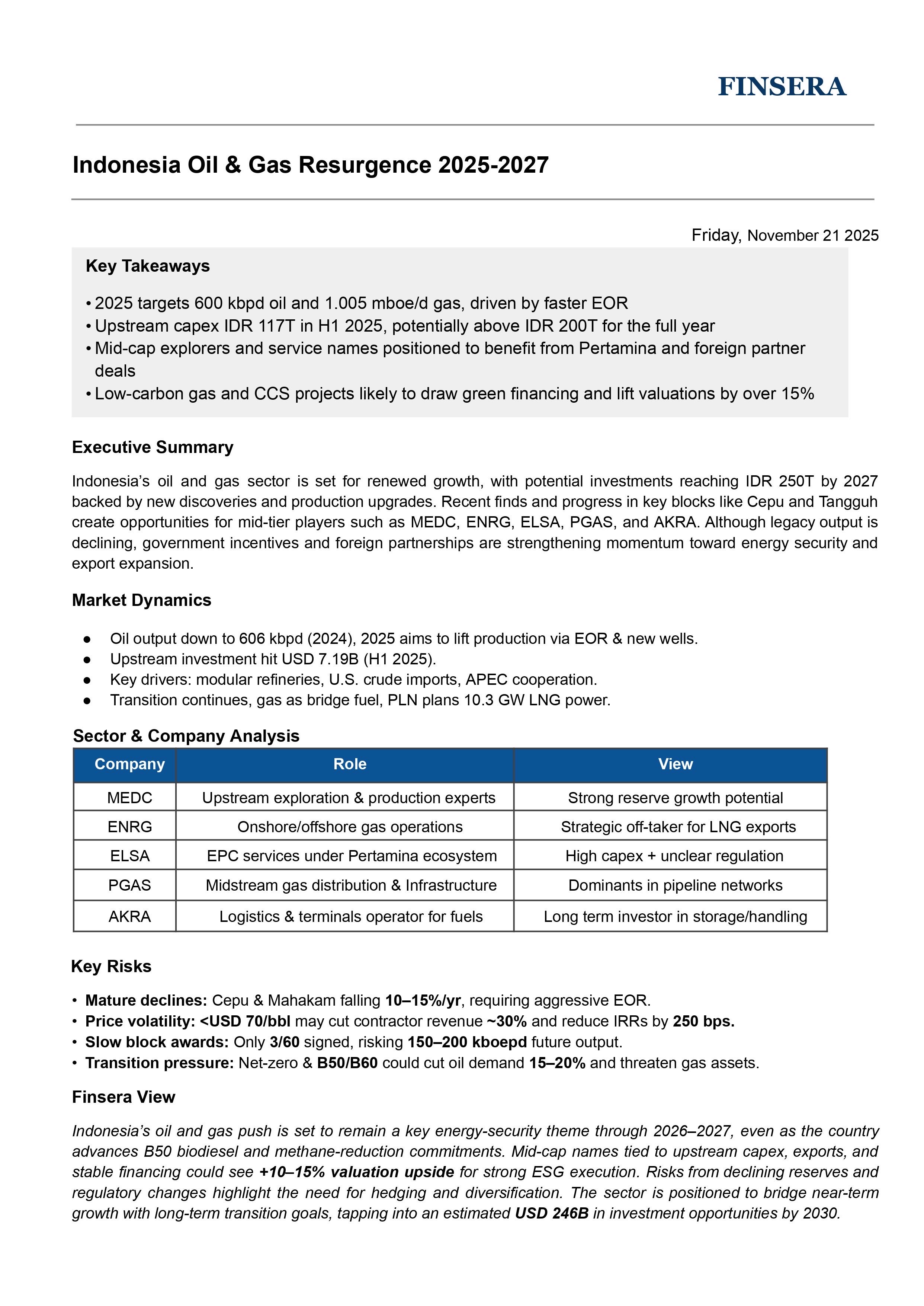 PT. Medco Energi Internasional Tbk (MEDC) bergerak dalam bidang eksplorasi dan produksi minyak dan gas bumi dan kegiatan energi lainnya, pengeboran darat dan lepas pantai, dan investasi (langsung dan tidak langsung) pada anak perusahaan. Perusahaan mulai beroperasi secara komersial pada tanggal 13 Desember 1980.