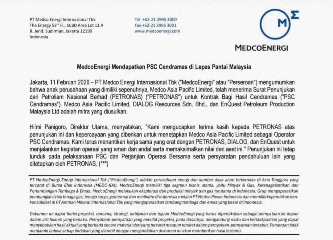 * *MEDC* : *PT Medco Energi Internasional (MEDC)* mengumumkan bahwa anak usaha yang dimiliki sepenuhnya, Medco Asia Pacific Ltd ditunjuk Petroliam Nasional Berhad (PETRONAS) sebagai operator PSC Cendramas. Penunjukan ini tetap tunduk pada pelaksanaan PSC dan perjanjian operasi bersama serta persyaratan pendahuluan lain yang ditetapkan oleh PETRONAS. (Publikasi emiten)