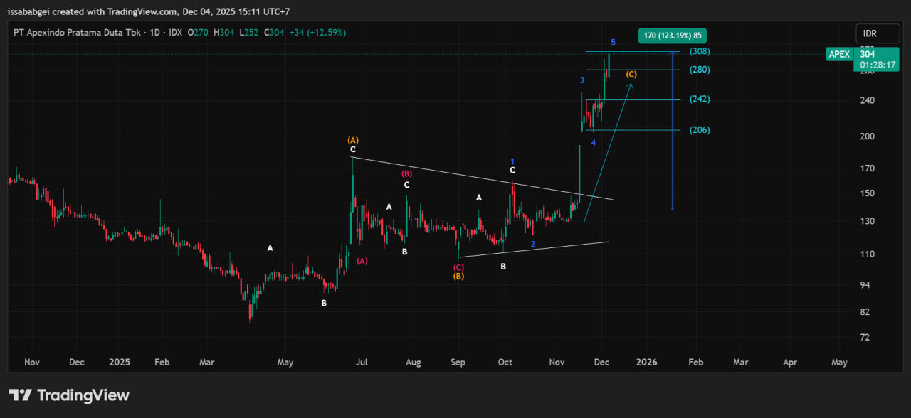 TP1: Rp4.200 (Resistance Minor, area awal breakdown sekaligus konfluensi MA20–50; menjadi target realistis pullback pertama).