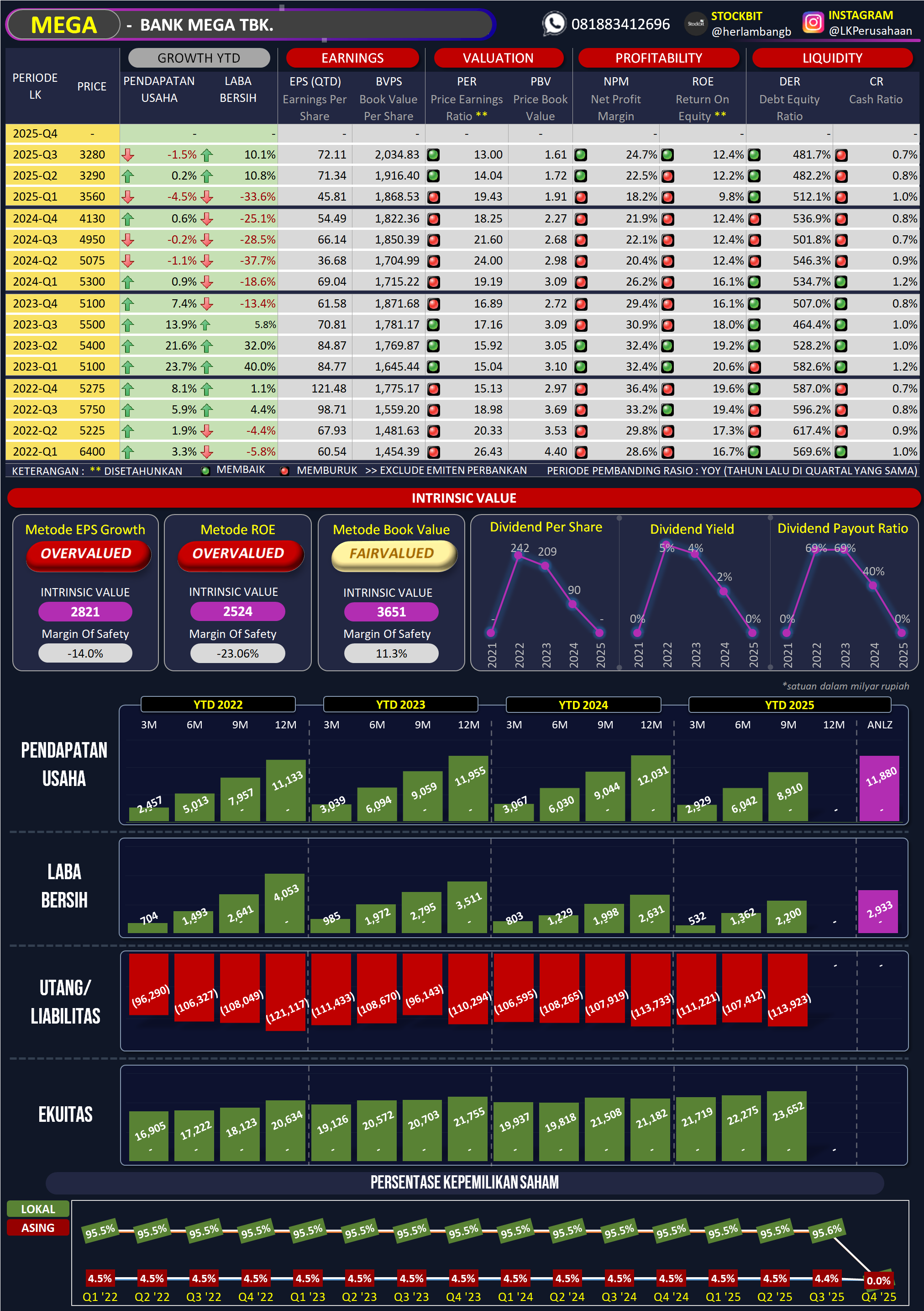 STOCKWATCH.ID (JAKARTA) – PT Bank Mega Tbk (MEGA) membukukan laba bersih sebesar Rp2,19 triliun (Rp187 per saham) pada kuartal III 2025, tumbuh sebesar 10,12% jika dibandingkan Rp1,9 triliun (Rp170 per saham) pada kuartal III 2024.