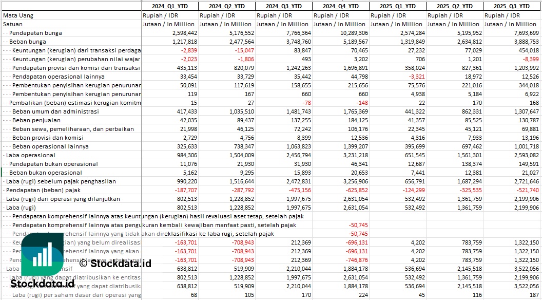 STOCKWATCH.ID (JAKARTA) – PT Bank Mega Tbk (MEGA) membukukan laba bersih sebesar Rp2,19 triliun (Rp187 per saham) pada kuartal III 2025, tumbuh sebesar 10,12% jika dibandingkan Rp1,9 triliun (Rp170 per saham) pada kuartal III 2024.