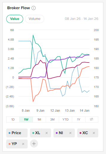 - Top broker YP dengan lot besar tiap transaksi mengindikasikan adanya akumulasi oleh big money.
