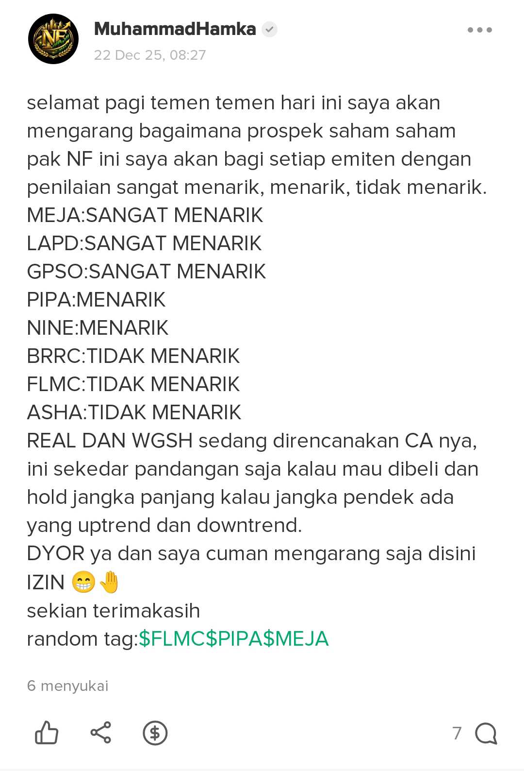 @MuhammadHamka coba holder $LAPD nyerok $FLMC diharga 140 pas saya call,udah cuan sekarang padahal FLMC keterbukaan informasinya belum keluar. kalau udah keluar wah amazing tuh.holder $MEJA tenang aja pengendali lama udah keluar semua