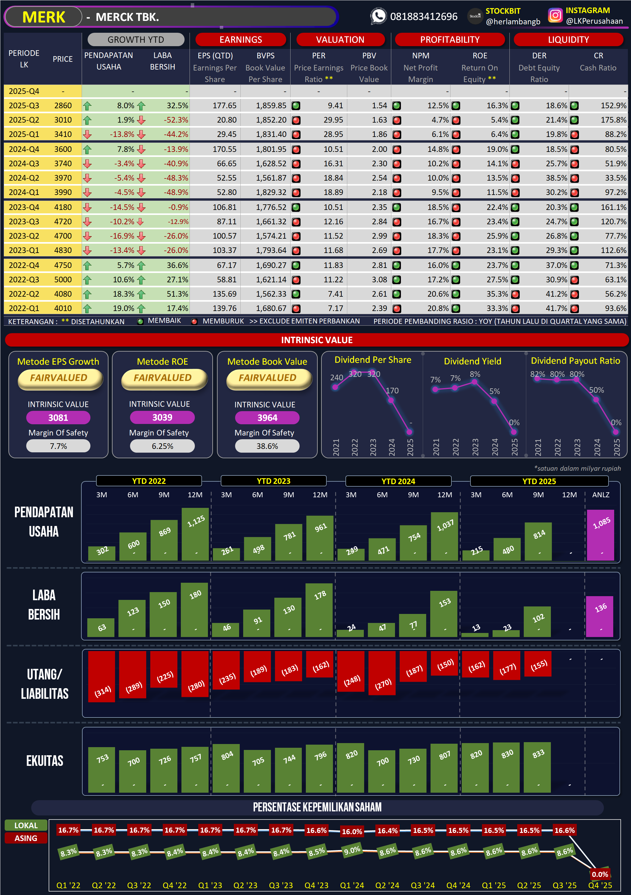 Bagi investor, ada beberapa hal yang bisa dipelajari dari kasus MERK ini. Pertama, MERK adalah contoh klasik anak usaha multinasional yang secara kualitas operasional tidak jelek, tapi jalur growth selalu berada di bawah remote control induk. Ketika grup mau mendorong segmen tertentu seperti di 2021-2022, angka mendadak terlihat luar biasa. Ketika grup memutuskan menarik satu lini bisnis atau mengatur ulang portofolio, pendapatan bisa terpangkas belasan % dalam satu tahun, meskipun tim lokal tidak berbuat salah besar. Kedua, fluktuasi laba kuartalan menunjukkan bahwa ini bukan saham yang setiap kuartal akan memberikan grafik mulus. Ada kuartal yang sangat jelek seperti Q2 2025, lalu disusul kuartal sangat kuat seperti Q3 2025. Jadi untuk yang mencari cerita multi bagger yang lepas dari kendali induk dan bisa ekspansi agresif, MERK mungkin bukan jawabannya. Namun untuk yang mencari emiten farmasi mapan, dengan siklus naik-turun tapi secara struktur masih mampu memulihkan margin setelah dihantam restrukturisasi, data 2025 memberi sinyal bahwa MERK belum selesai. Hanya saja, batas atasnya hampir selalu akan ditentukan sejauh mana induk di Jerman mengizinkan anaknya di Indonesia tumbuh. Upgrade Skill https://cutt.ly/Ve3nZHZf