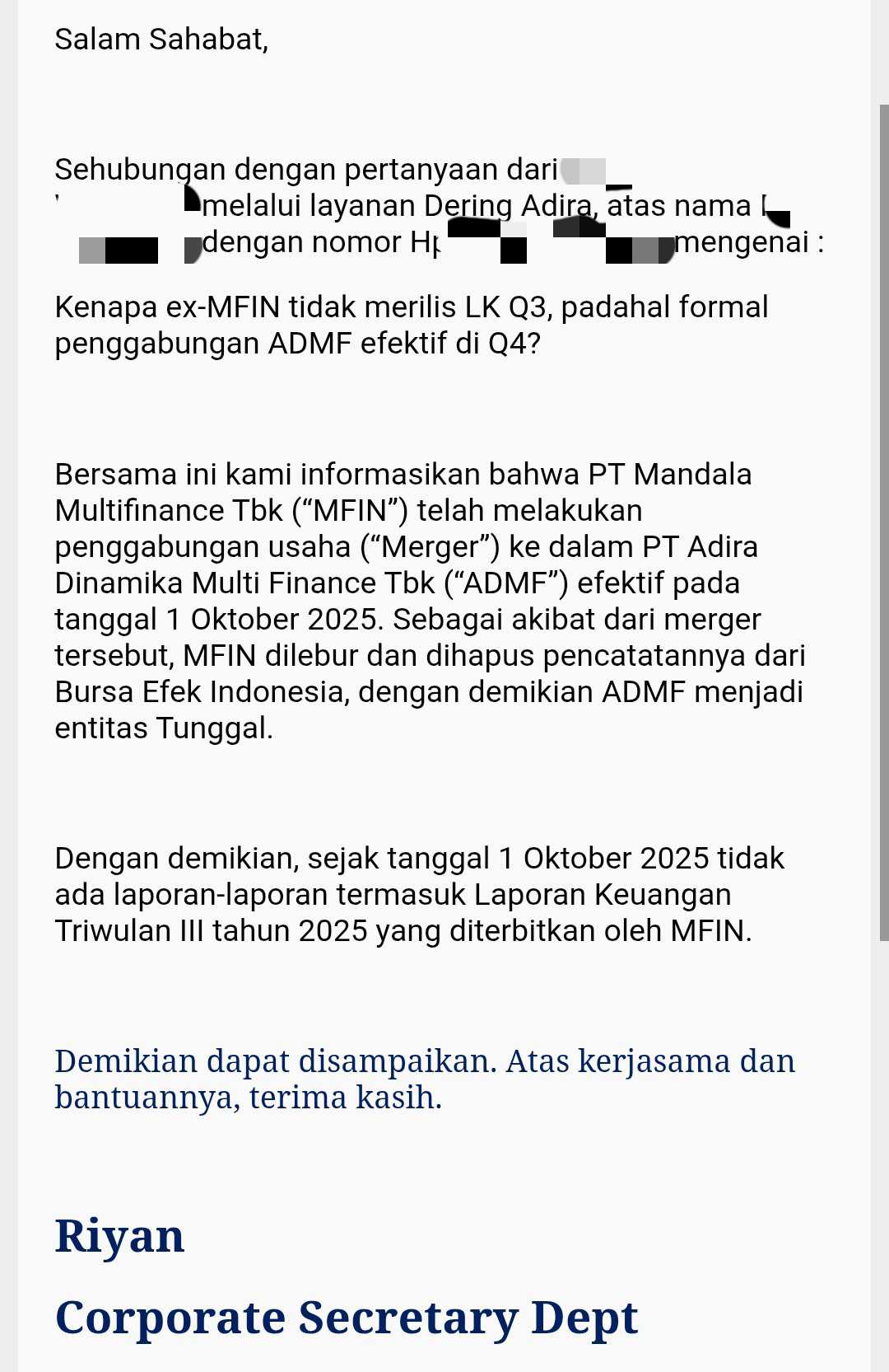 pertanyaan ane dah dijawab Corsec $ADMF gaes, inti yg ane tangkep sih krn $MFIN dah bubar duluan.. (sementara kewajiban buat nyeritain Q3 ex-MFIN bukan di ADMF?)