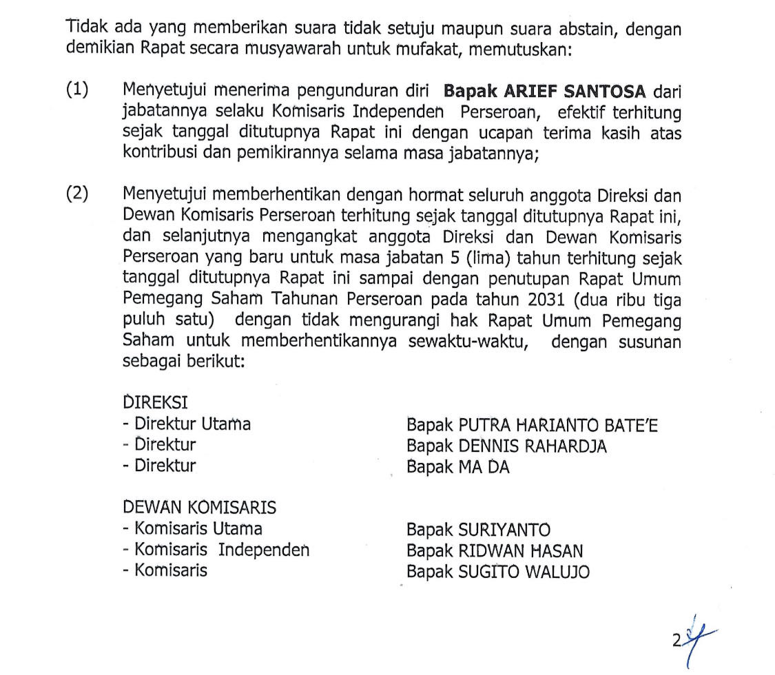 Hasil dari RUPSLB tersebut menghasilkan tiga keputusan krusial. Pertama, rapat menyetujui pengunduran diri Arief Santosa dari posisinya sebagai Komisaris Independen. Pengunduran diri ini efektif berlaku sejak penutupan rapat.