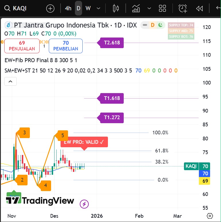 Daily: Netral. Harga berada di tengah Bollinger Band, volume transaksi menurun (sepi peminat sementara). Ini adalah fase akumulasi senyap (Silent Accumulation) sebelum pergerakan besar berikutnya.