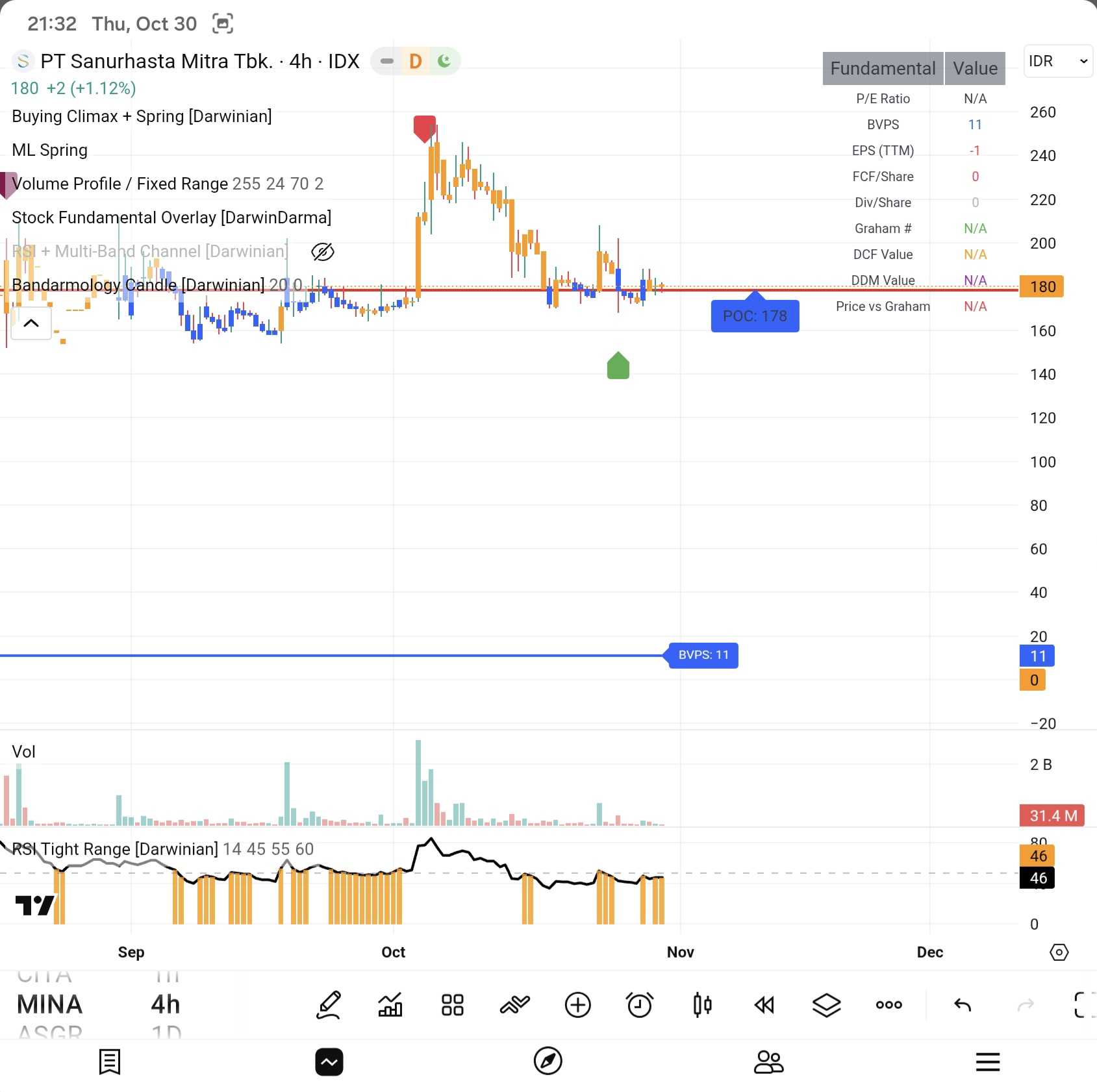 @Nov1taNirmala $MINA sangat overvalue, dan EPS minus.. but yet harganya masih tinggi.. sejak agustus base nya di 180.. jelas kenaikannya sentiment driven.. ada tanda akumulasi dan wyckoff spring memberikan signal 10 candle yang lalu.. peluang naik masih ada, tapi karena Value nya sangat rendah, jika ada pilihan saham lain yg sedang akum dan Valuenya bagus, mending lari ksana..
