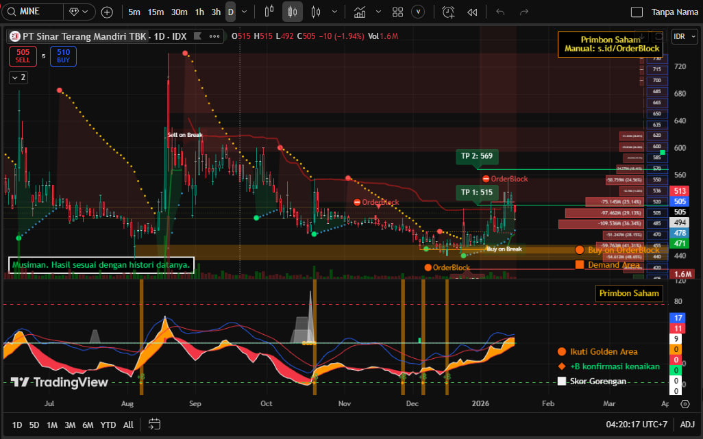 @AmmiIs23 $MINE menunjukkan rebound dari fase akumulasi jangka menengah. Terdapat pola breakout mini dari fase base di area 460-480 dengan volume meningkat tajam, mengindikasikan partisipasi bandar. MA10 (490) telah golden cross terhadap MA20 (475) yang menjadi sinyal bullish awal. Harga closing bertahan di atas dua MA tersebut walau mengalami minor rejection di kisaran 540. Volume meningkat signifikan selama breakout, namun sedikit turun saat koreksi, memberi indikasi distribusi masih terbatas.