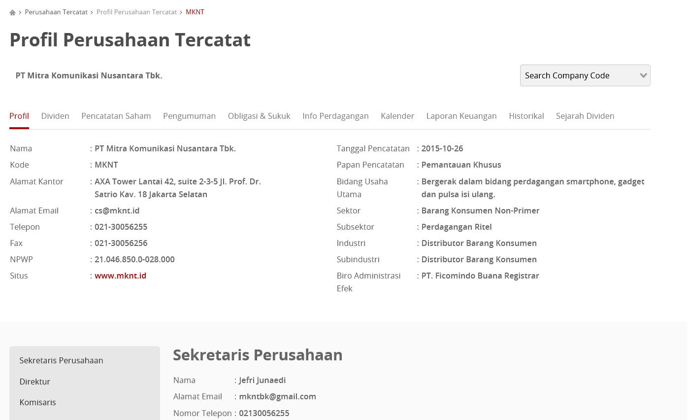 PT Mitra Komunikasi Nusantara Tbk didirikan pada tanggal 14 Juli 2008. Bidang usaha Perseroan adalah distributor produk telekomunikasi. Perseroan memiliki peran besar sebagai distributor terbesar untuk produk prepaid voucher dan sim card. Peran tersebut diwujudkan dengan menggandeng perusahaan operator seluler terkemuka, Telkomsel, melalui Telkomsel Distribution Center (TDC) yang tersebar di sejumlah kota besar di Indonesia. Bersama dengan Telkomsel Indonesia, Perseroan menghadirkan pusat layanan GraPari yang menjadi pusat layanan pelanggan dengan konsep layanan modern dan digital. Dengan GraPari, pelanggan dapat lebih mudah sek... Read More