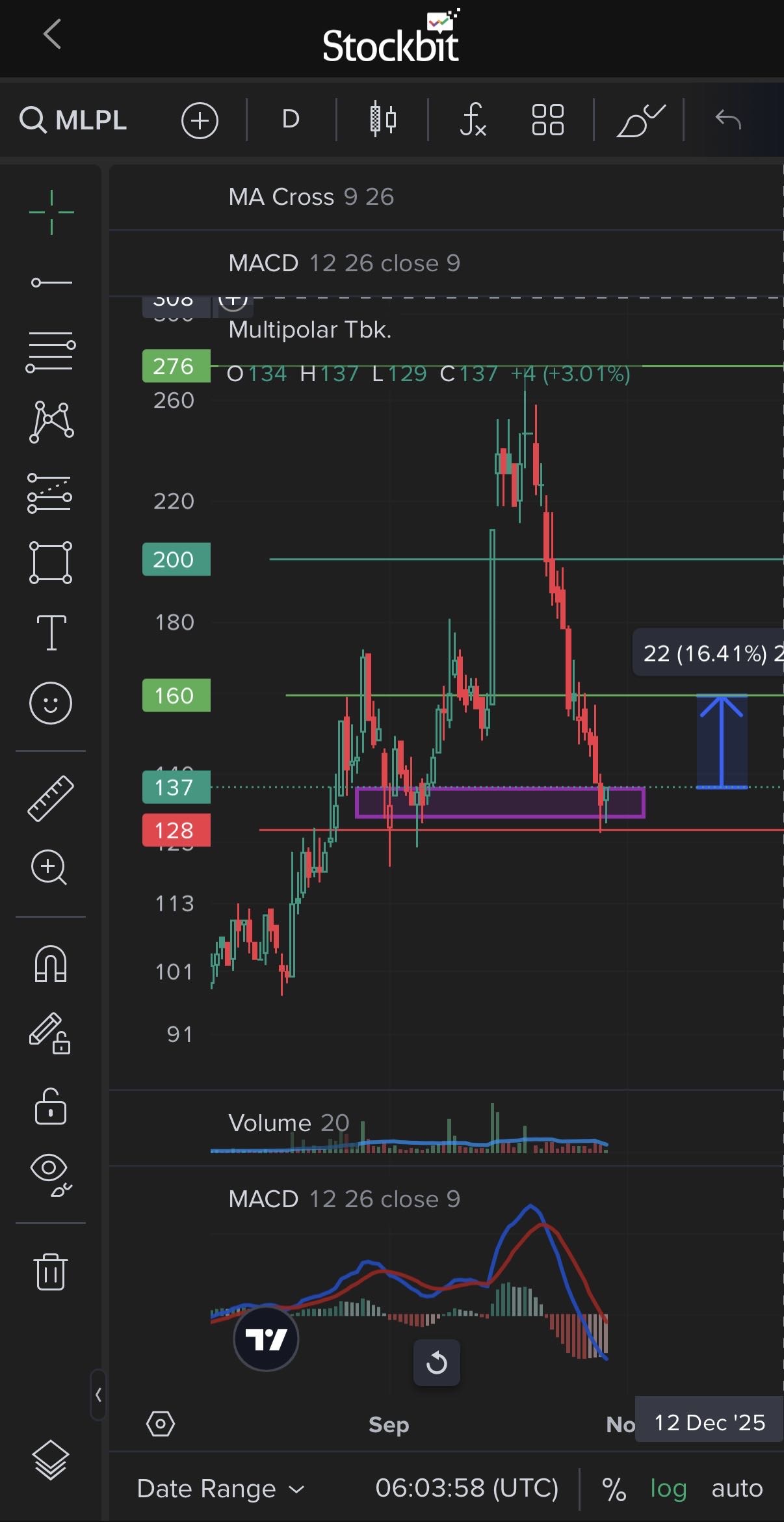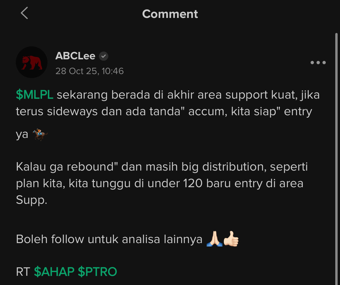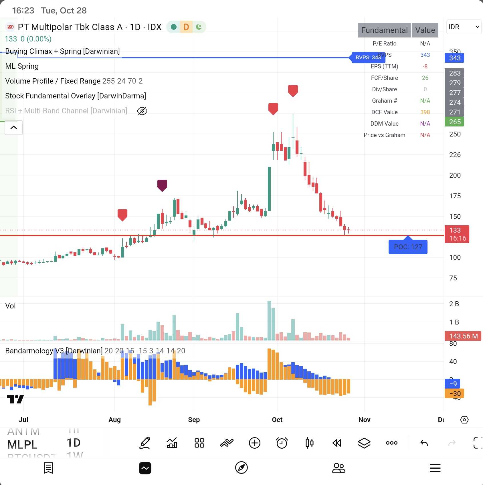 @ArdaffaMaulana $MLPL masih distribusi, sekarang tertahan di 127, itu POC (Point of Control) di volume profile, pada harga ini banyak yang hold.. jika bertahan dan berkutat di sekitar 127 itu indikasi dimulainya fase re-acumulasi (jika ada).. di bandarmology nanti tandanya jika histogram negative mulai menyusut..