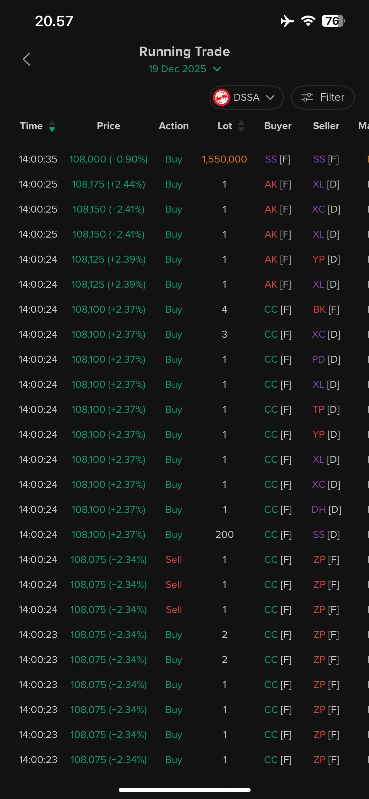 Gue menaruh curiga terhadap SS yg spil barang $DSSA 1.5jt lot diharga 108.000 dinego, disaat BK akum mau ngangkatin DSSA. Seandainya BK ataupun asing yg lain tidak memberi perlawanan 1-3minggu kedepan buat haka ngangkatin DSSA, maka sediakan uang dingin buat serok bawah, kalo tidak out segera secepat cepatnya, karna kemungkinan bakal ke 90ribuan ataupun menyelam lebih dalam. Alamat karam nasib ritel teri seperti gue yg hold DSSA. Walaupun gak megang ribuan ataupun ratusan lot, mines 7-10% damage nya terasa. Takut CL bisa senasib dgn pucukers $MLPT dan $DCIIππ€£ hanya sebuah opini liar dan bandarmology dari gue, karna lagi nungguin momentum buat masuk tambah muatan ataupun TP keluar, yg paling utama janji pada diri sendiri tidak CL lebih 3% dari avg. Dyor bukan ajakan jual dan beliπ