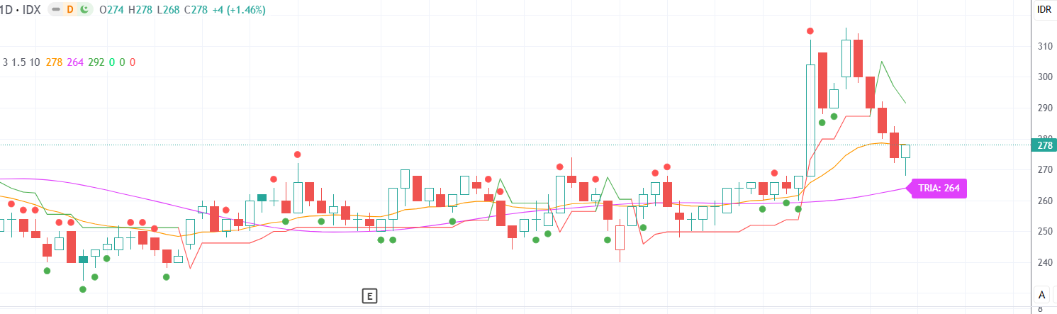 Jangka Menengah: Tren masih bullish karena EMA10 > EMA20 > EMA60, tetapi butuh konfirmasi harga harus kembali ke atas 310 untuk melanjutkan uptrendnya