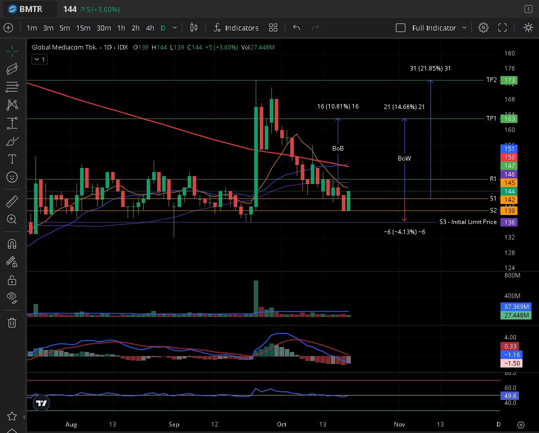 $BMTR kemarin membuat pantulan dari S2. Menarik untuk dipantau kalau berhasil BO > R1 untuk BoB.