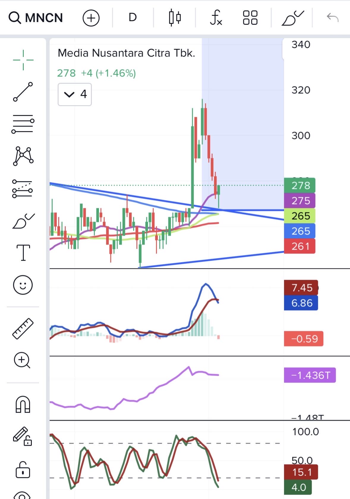 Jangka Pendek: Saham sedang koreksi setelah rally cepat. Selama bertahan di atas 278β280, masih ada peluang rebound. Jika breakdown ke bawah 278, target koreksi ke 264.