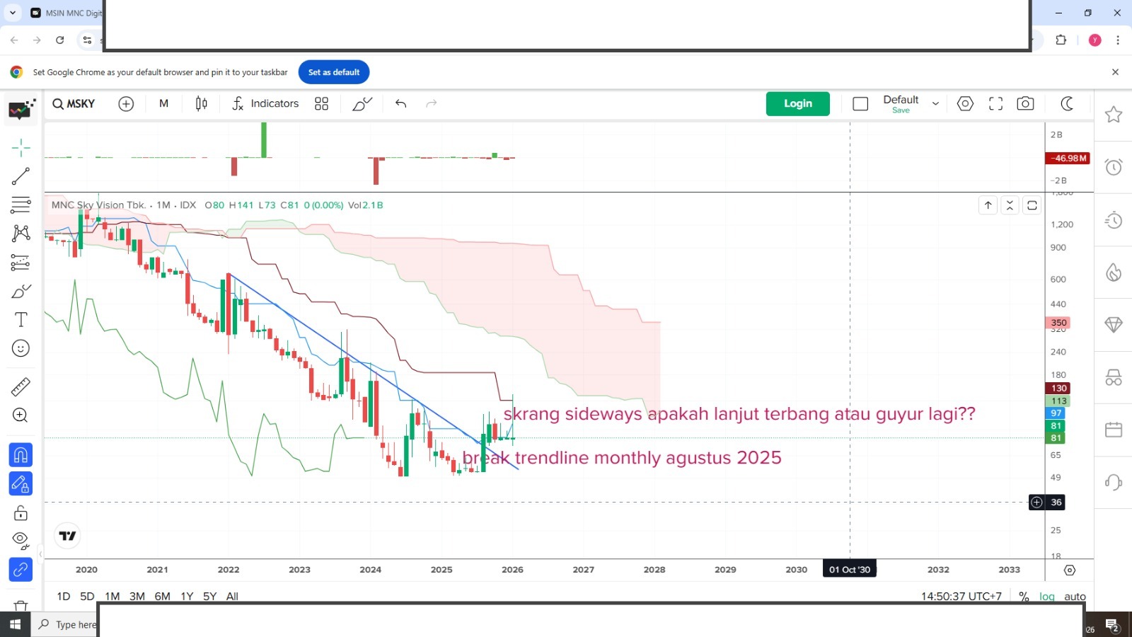 bulan agustus 2025 sudah break dari downtrend panjangnya..dan sejak saat itu sampai skrang secara motnly masih sideways hmpir 6 bulan...dan skrang bertahan di masa konsolidasi...apkah akan lanjut tiarap ke 50 lagi??atau naik ke bulan???nitip di harga 82 market maker..terbangkan ya jangan dibuat turun lagi. sudah 12 tahun downtrend panjang..sekali terbang buat terbang ke langit setinggi tingginya