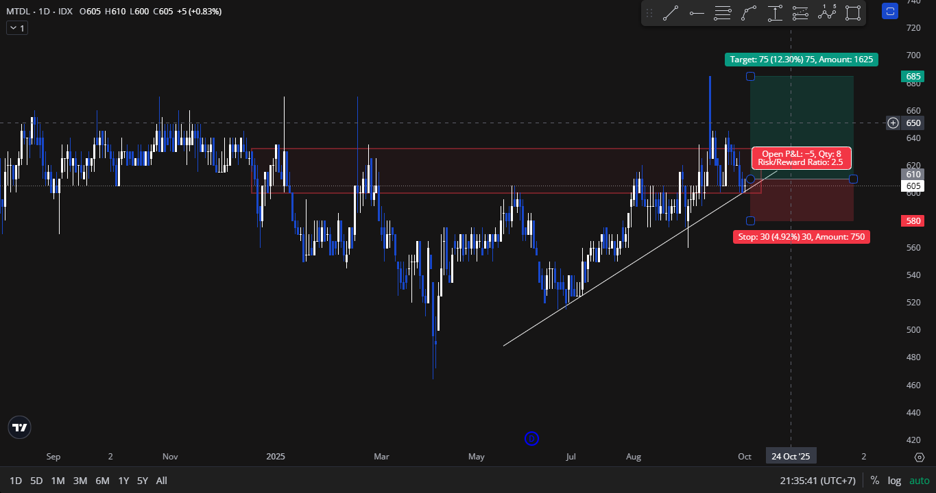 Untuk trading jangka pendek, MTDL saat ini cenderung lebih menarik karena kekuatan beli dan konsolidasi di area support-resistance ketat. Namun, pergerakannya juga relatif terbatas, jadi tetap disiplin stop loss di bawah support terdekat jika entry.